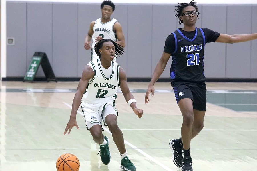 FPC's Tony Coates (12) brings the ball upcourt against Deltona. Photo by Brent Woronoff