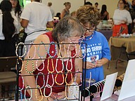Two customers look at a vendor's jewelry. Photo by Hannah Hodge