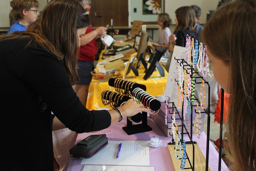 A customer looks at jewelry from a vendor. Photo by Hannah Hodge