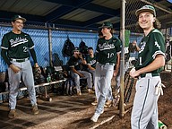 Flagler Palm Coast players enjoy some laughs in the dugout before the game against Seabreeze on Friday, Feb. 28 at the Ormond Beach Sports Complex. Players in foreground Jordan Gonzalez (left), Brenin Striplin (second from right) and Adam Kleinfelder (right). Photo by Michele Meyers