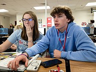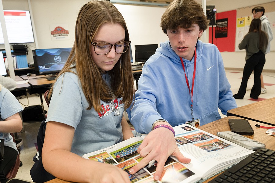 Seabreeze sophomores Gabryelle Wadding (left) and Logan Yocum (right) discuss yearbook content and layout for the Sandcrab baseball team and junior varsity pages. Photo by Michele Meyers