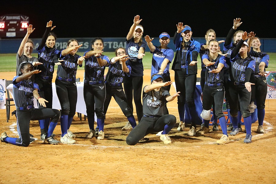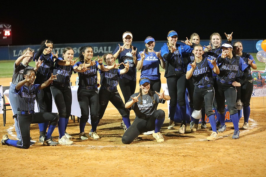The Matanzas softball players do the Vikings horn gesture in honor of Juliet Fogel's signing with St. Johns River State College. Photo by Brent Woronoff