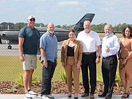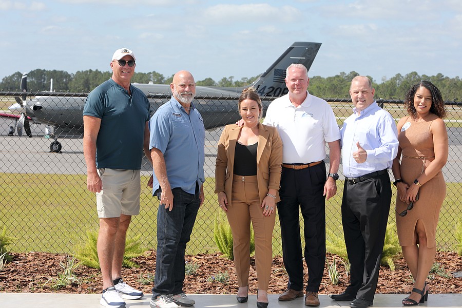 The Landing Strip owners Jamie Bourdeau, Joe Wright and Chelsea Herbert with Flagler Executive Airport Director Roy Sieger, Palm Coast-Flagler Regional Chamber of Commerce President John Phillips and Chamber Operations Manager Kelsie Lombard. Photo by Brent Woronoff