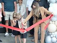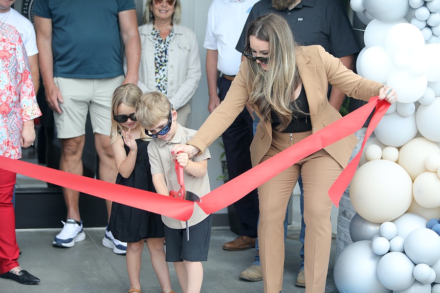 Chelsea Herbert (right) and her children Poppy Jane and Truett cut the ribbon on the grand re-opening of the Landing Strip Tavern at the Flagler Executive Airport. Photo by Brent Woronoff