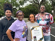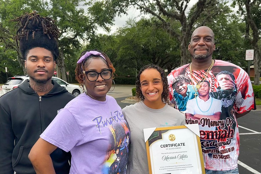 Mariah Mills receives a plaque and a $1,000 scholarship from the Nehemiah Gilyard Scholarship Foundation. From left, Elijah Gilyard, Calandra Gilyard, Mariah Mills and Sim Gilyard. Courtesy photo by Rachel Mills