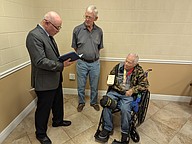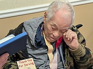Angel Cordero reads the proclamation from South Korea honoring Luciano Arce with an Ambassador of Peace medal. Marine Corps veteran Jeff Kingdon is in the background. Photo by Brent Woronoff