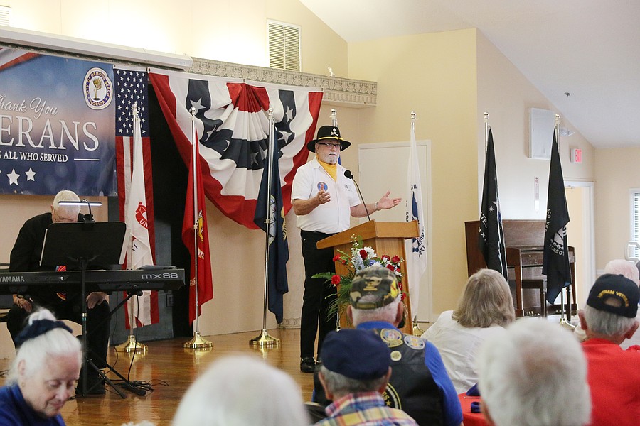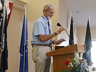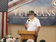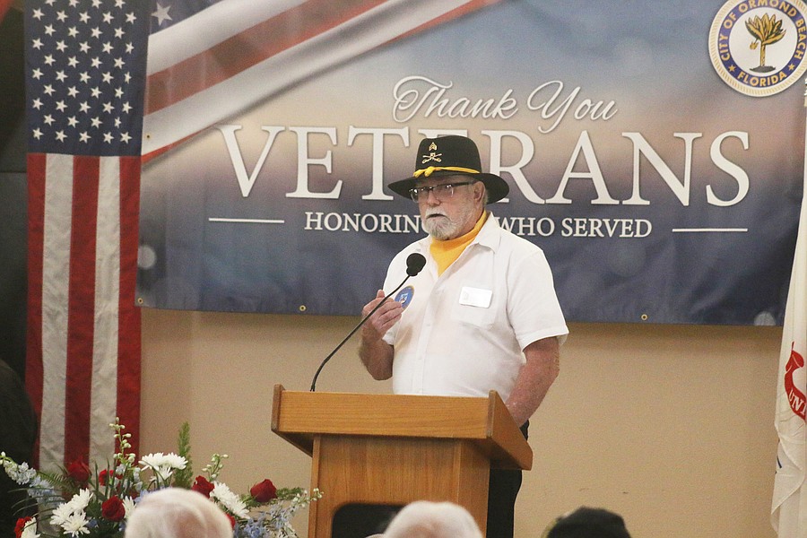 Army veteran Bob Adkins, past president of the Vietnam Veterans of America Chapter 1048 and Missing in America Project veteran recovery officer, delivers the keynote speech during Ormond Beach's Veterans Day Celebration on Thursday, Nov. 6. Photo by Jarleene Almenas