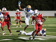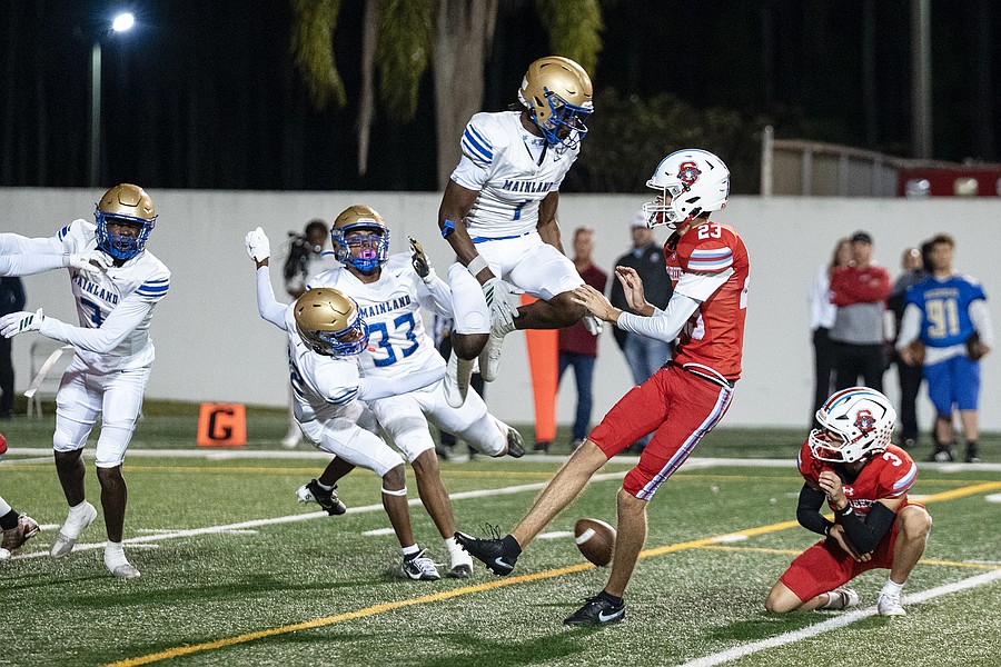 Mainland linebacker Dennis "Tank" King III (1) blocks an extra-point kick by Luke Zboch (23) in the rivalry match at the Daytona Stadium on Friday, Oct. 31. Photo by Michele Meyers