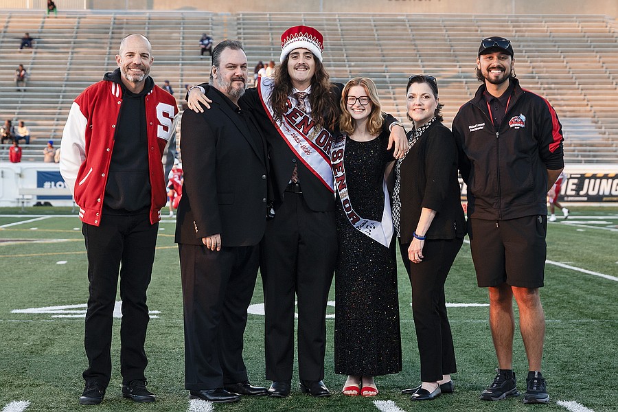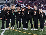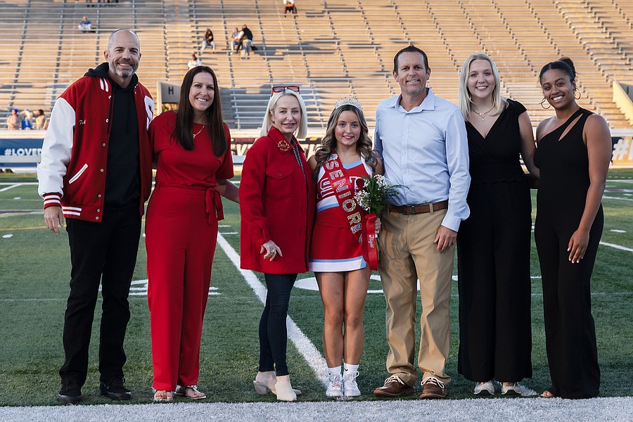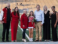 Seabreeze Homecoming queen Hayden Alexander (center) poses with her family, Principal Tucker Harris (left), cheer coaches Amie MacDonald (second from left), Lauren Ott (second from right) and Paris Smith (right) on senior night at the Daytona Stadium on Friday, Oct. 31. Photo by Michele Meyers