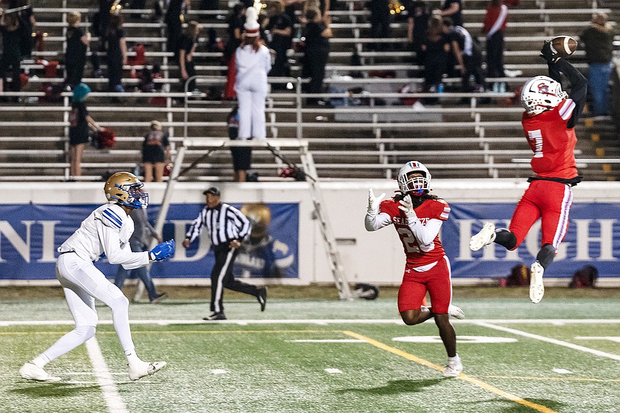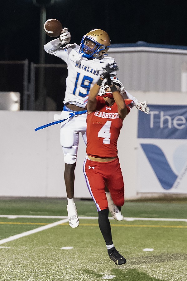 Seabreeze's Cash Kurz (7) intercepts the pass intended for Mainland's Jaden "Melo" Parks (left) in their rivalry match at the Daytona Stadium on Friday, Oct. 31. Photo by Michele Meyers