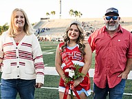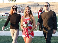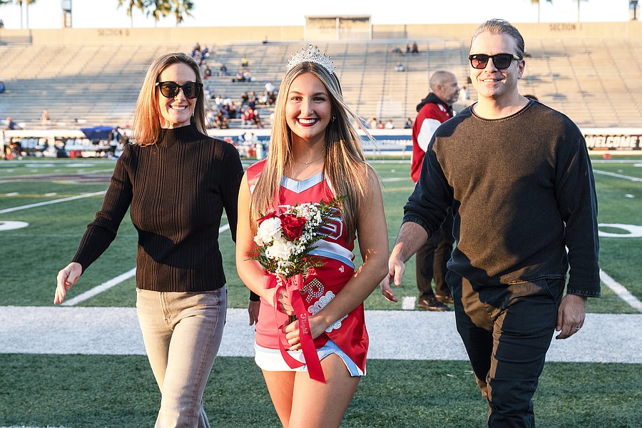 Seabreeze cheerleader Lillian Kilic (center) walks with her parents Amanda (left) and Luke (right) on Senior Night at the Daytona Stadium on Friday, Oct. 31. Photo by Michele Meyers