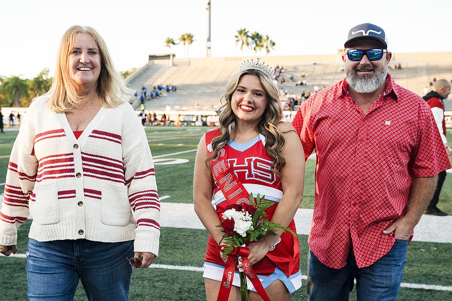 Seabreeze cheerleader Casey Jensen Gainey (center) poses with her parents Beth Jensen (left) and Jason Gainey (right) on Senior Night at the Daytona Stadium on Friday, Oct. 31. Photo by Michele Meyers