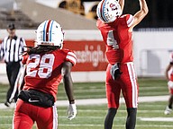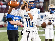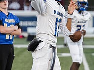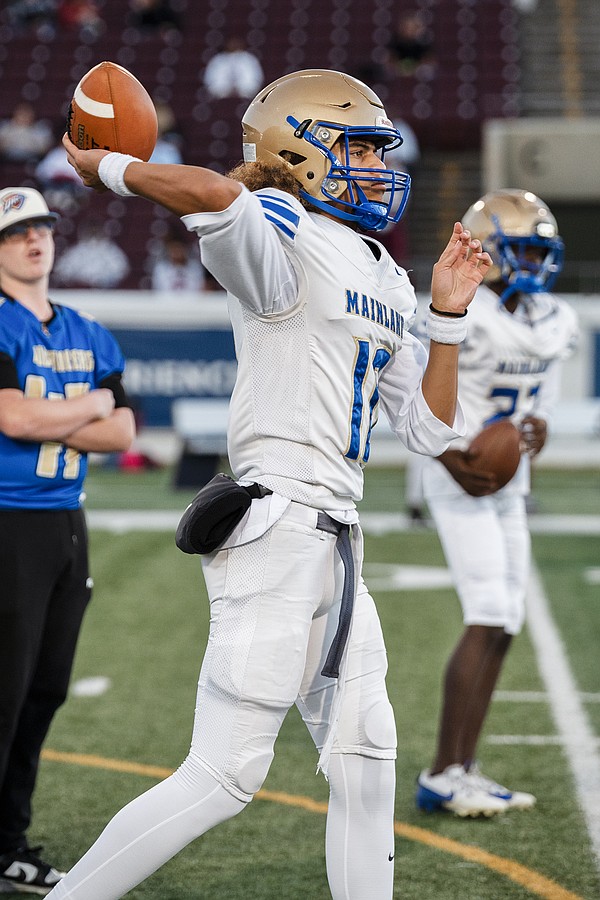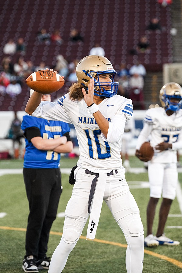 Mainland quarterback Sebastian Johnson warms up before the rivalry game against Seabreeze at the Daytona Stadium on Friday, Oct. 31. Photo by Michele Meyers