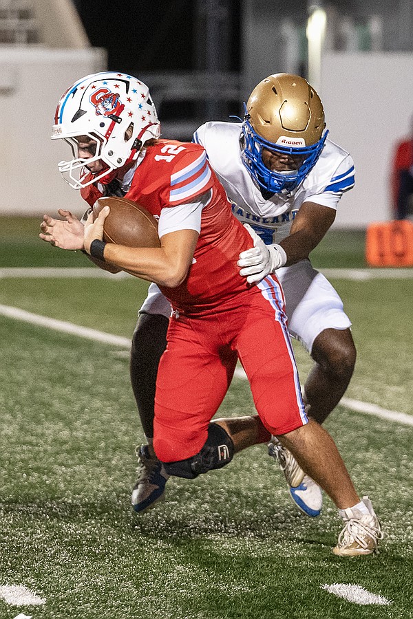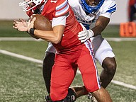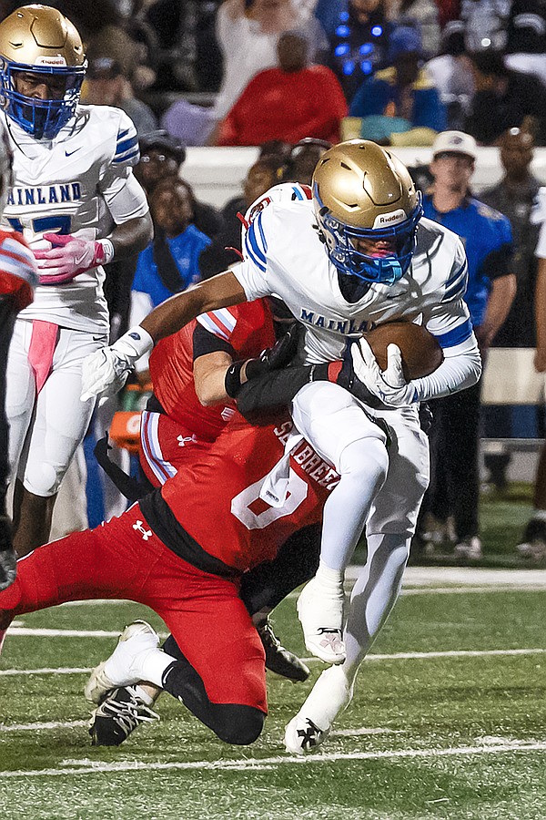 Mainland's Kiarin Sullivan sacks Seabreeze quarterback Jace Gainer in the rivalry match at the Daytona Stadium on Friday, Oct. 31. Photo by Michele Meyers