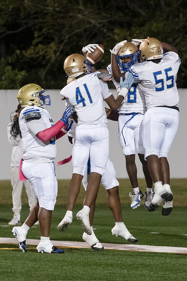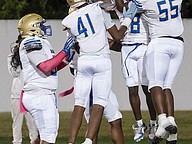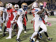 Mainland celebrates Jordan Jones' (16) kickoff return in the rivalry match against Seabreeze at the Daytona Stadium on Friday, Oct. 31. Photo by Michele Meyers