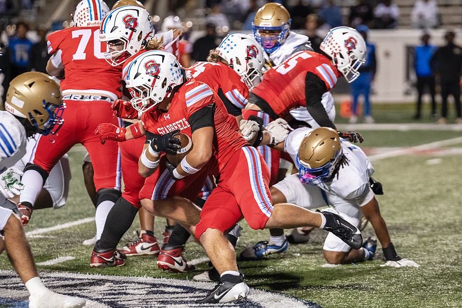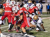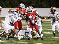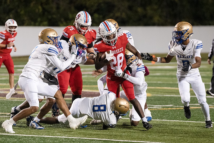 Seabreeze running back Logan Smith (center) looks for an opening in the chaos during the rivalry match against Mainland at the Daytona Stadium on Friday, Oct. 31. Photo by Michele Meyers