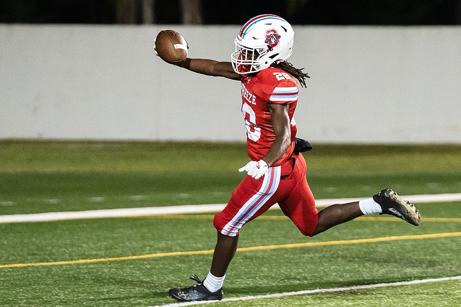Seabreeze running back Jeremias George answered with a 31-yard touchdown run. But Mainland running back Braylyn Simmons wrapped up the quarter by recovering his own fumble in the end zone to give the Bucs a 28-6 lead.
