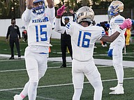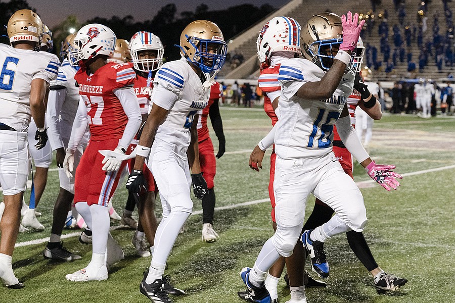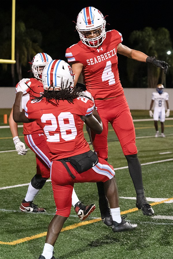 Seabreeze's Danny Spada (4) celebrates with Jeremias George (28) after George's touchdown in the rivalry match against Mainland at the Daytona Stadium on Friday, Oct. 31. Photo by Michele Meyers
