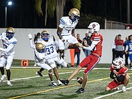 Mainland quarterback Sebastian Johnson launched a 61-yard touchdown pass to Butler in the second quarter then completed a pass to Flores in the third quarter who sprinted into the end zone for a 65-yard touchdown. Johnson finished with 205 yards passing with three touchdowns.