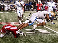 Mainland's running back Braylin Simmons flies to a first down in the rivalry match against Seabreeze at the Daytona Stadium on Friday, Oct. 31. Photo by Michele Meyers
