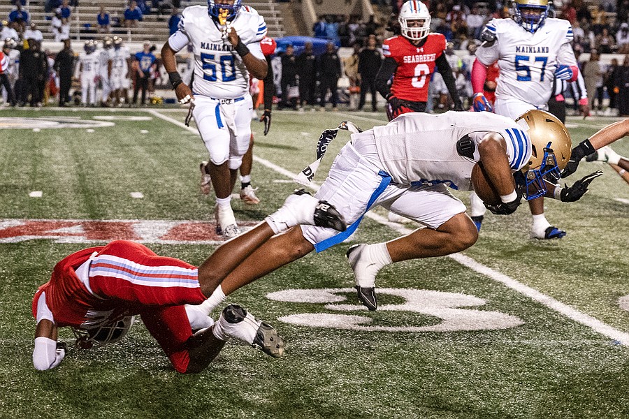 Mainland's Christian Cooper (right) drives toward the end zone as Seabreeze's Grant Losey (0) makes the tackle at the Daytona Stadium on Friday, Oct. 31. Photo by Michele Meyers