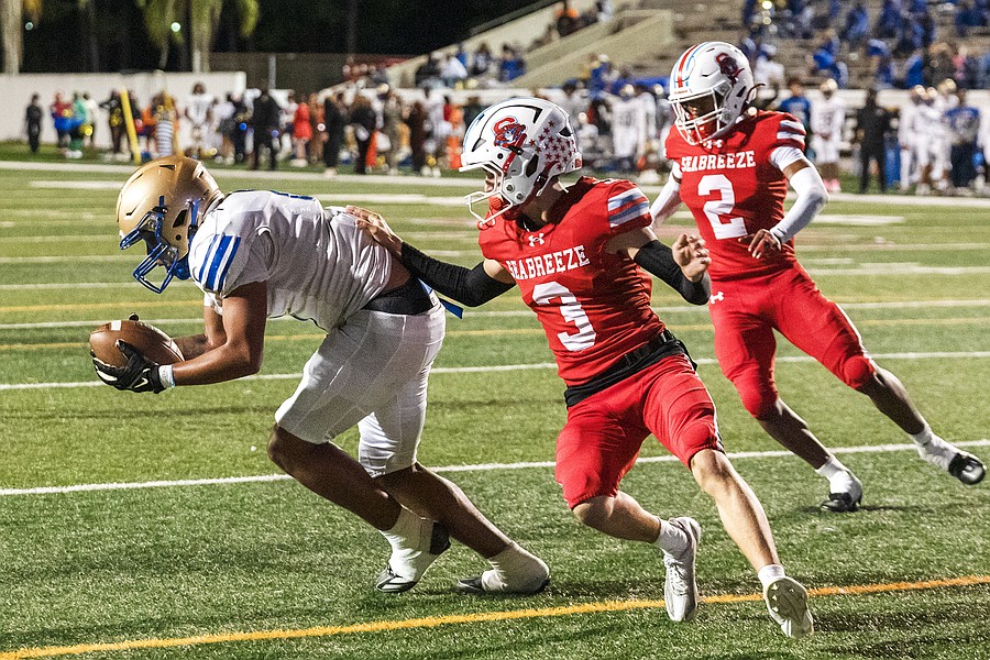 Mainland's Kadin Flores (center) sprints toward the end zone as Seabreeze's Grant Losey (left) chases him down at the Daytona Stadium on Friday, Oct. 31. Photo by Michele Meyers