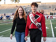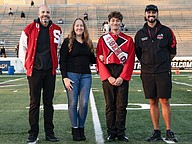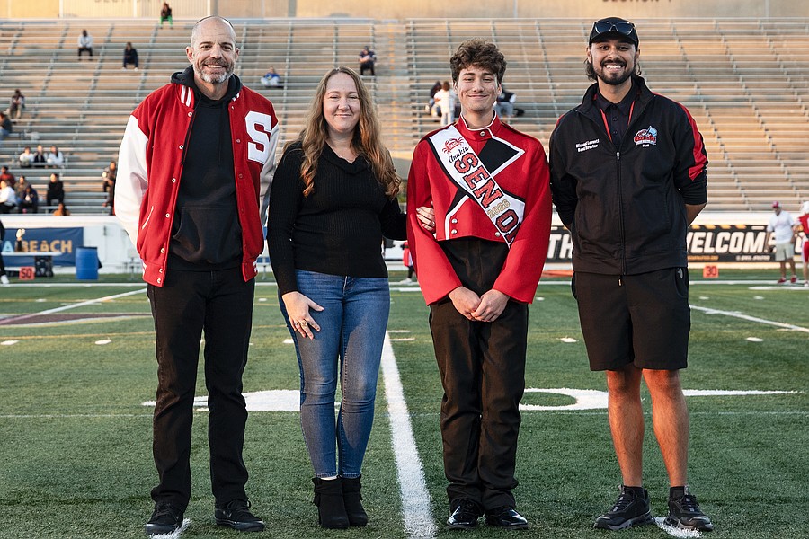 Seabreeze student Anakin Reyna poses with family, principal Tucker Harris (left) and band director Michael Levanti (right) on Senior Night at the Daytona Stadium on Friday, Oct. 31. Photo by Michele Meyers