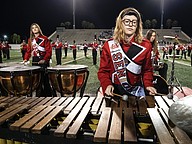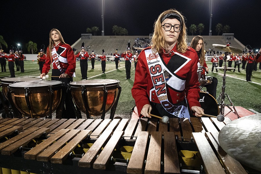 Seabreeze's Amanda Larson plays the marimba during halftime at the rivalry game against Mainland at the Daytona Stadium on Friday, Oct. 31. Photo by Michele Meyers