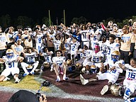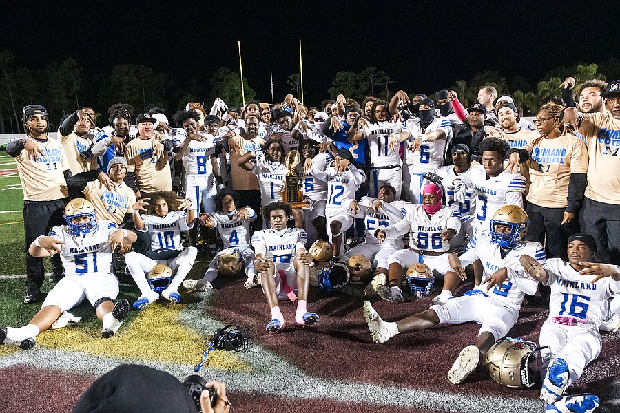 Mainland poses with the District 4-5A championship trophy after winning the rivalry match against Seabreeze at the Daytona Stadium on Friday, Oct. 31. Photo by Michele Meyers