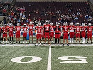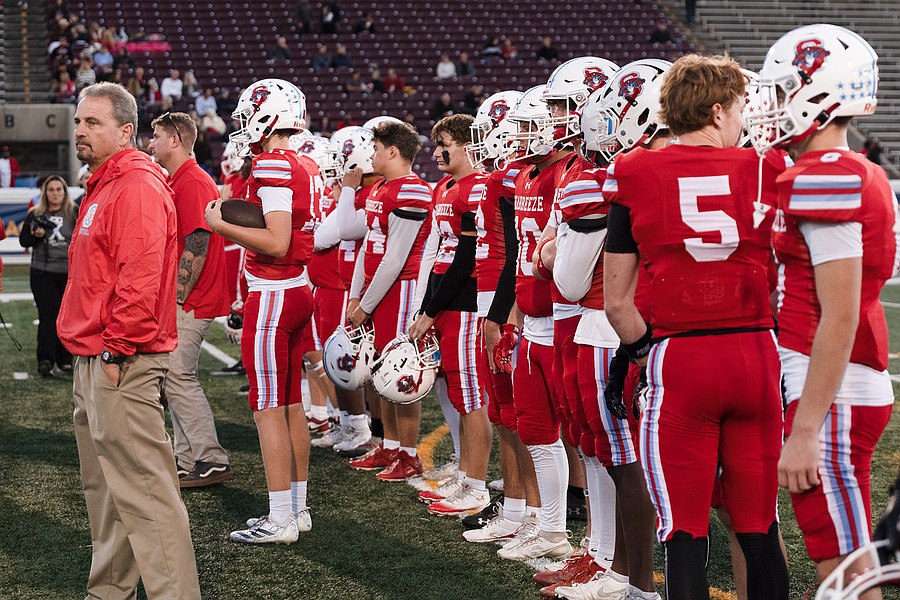 Seabreeze senior football players line up before the rivalry game against Mainland on Halloween night at the Daytona Stadium. 22 seniors will be graduating in 2026. Photo by Michele Meyers