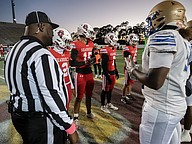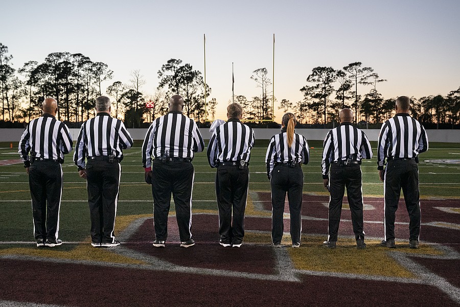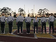 Referees pause for the national anthem before the Mainland-Seabreeze rivalry game at the Daytona Stadium on Friday, Oct. 31. Photo by Michele Meyers