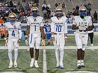 Mainland captains (left to right) Christian Cooper, Dennis "Tank" King III, Seabstian Johnson and Chevin Davis take the field for the coin toss before the rivalry game against Seabreeze on Friday, Oct. 31 at the Daytona Stadium. Photo by Michele Meyers