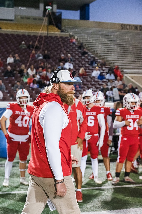 Seabreeze head coach Mike Klein watches from the sidelines during the rivalry match against Mainland at the Daytona Stadium on Friday, Oct. 31. Photo by Michele Meyers