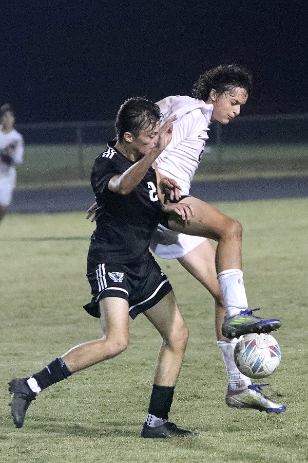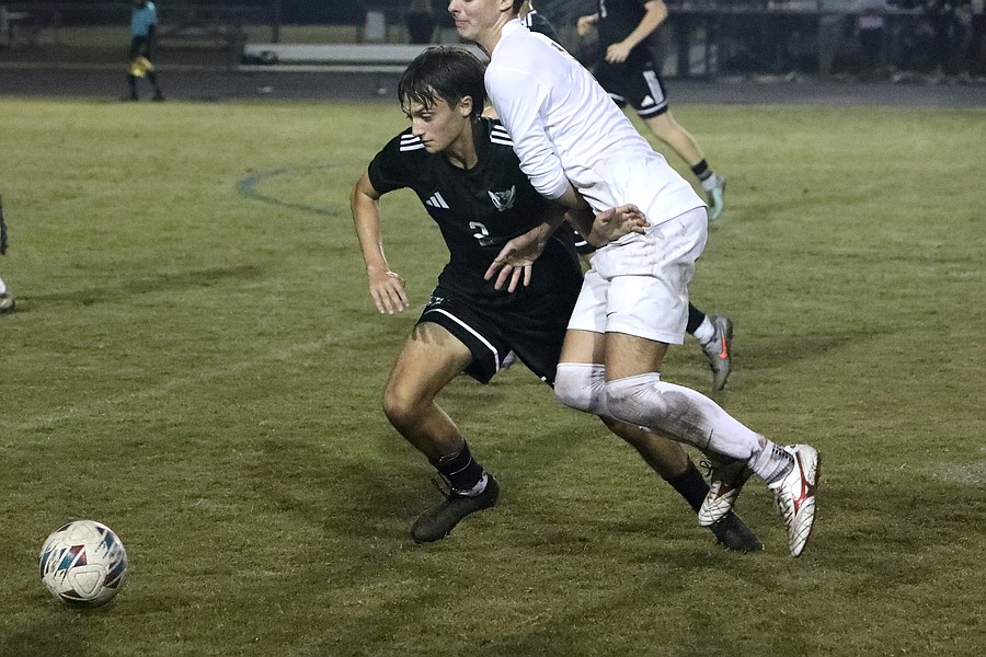 Jason Tavares (2) battles a Tocoi Creek player for possession. Photo by Brent Woronoff