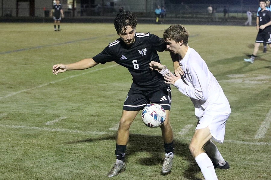 Matanzas' Matt Ciminera (6) battles for the ball with a Tocoi Creek player. Photo by Brent Woronoff