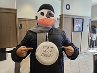 Enrique Torres wears an "Eat Mor Chikin" sign and hand-made cow mask to the Seminole Woods Chick-fil-A's grand opening. Photo by Sierra Williams
