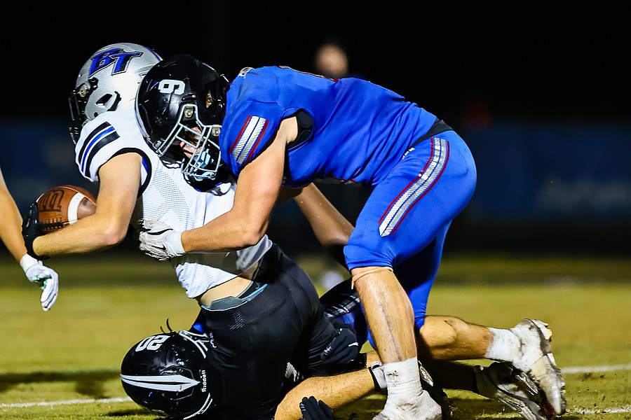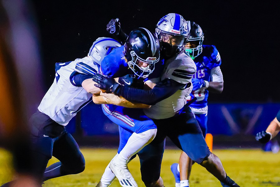 Two Bartram Trail players corral Matanzas quarterback Cole Walker. Photo by Keishia McLendon