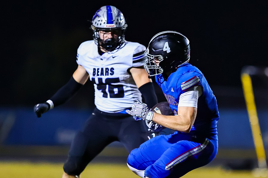 Matanzas receiver Jordan Schendorf (4) tries to run past Bartram Trail linebacker Griffin Szekeres. Photo by Keishia McLendon