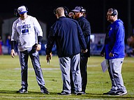 Matanzas coaches confer during a timeout. Photo by Keishia McLendon