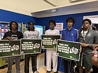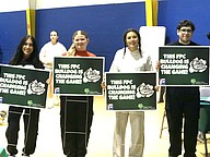 Flagler Palm Coast High schools students with their yard signs at the Bunnell Block Party at Carver gym. From left, Selena Miranda, Sarah Saunders, Jade Hreib and Cristhian Verdecia. Photo by Brent Woronoff