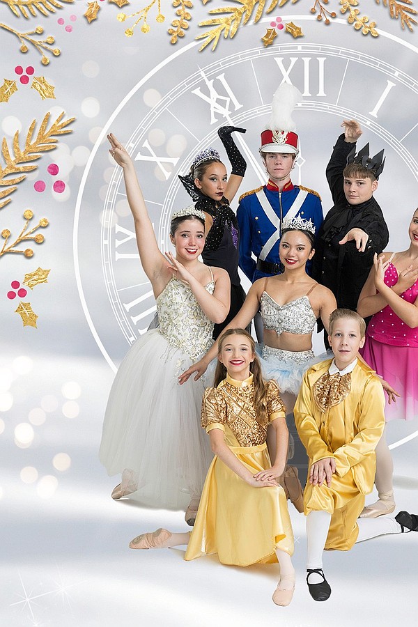 Front: Emery Crooke as Clara and Jayden Dawson as Clara’s brother Fritz. Middle: Gabriella Palmer as Snow Queen, Juliane Carpio as North Star, Amelia Palmer as Dew Drop. Back: Emma Thomas as Mouse Queen, Kelan Halloran as Nutcracker/Prince and Ralph Medley as Mouse King. Photo courtesy of Michael Cairns
