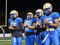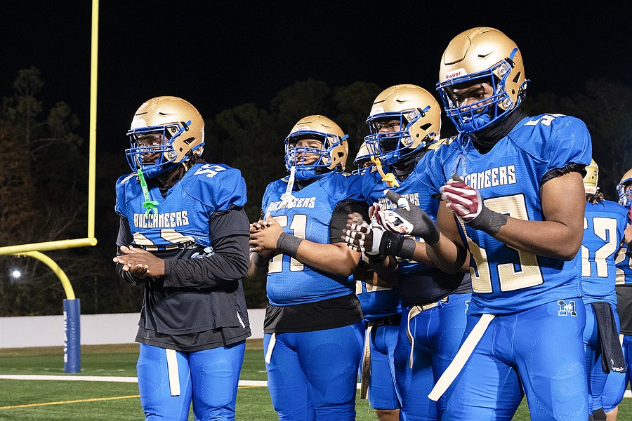 Mainland linemen (left to right) Chevin Davis Jr., Trayce Rinehart, Stephone Ross and Amarion Lane get pumped up before round two of the FHSAA playoffs against Mosley on Friday, Nov. 21 at the Daytona Stadium. Photo by Michele Meyers