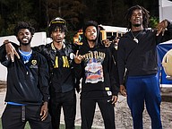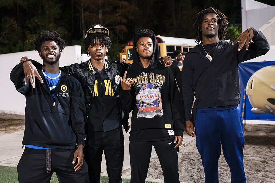Mainland alumni (left to right) Eddie Lake, K.J. Curry, Jameil Patrick and Phillip Moore attended the semifinal playoff game against Mosley on Friday, Nov. 21 at the Daytona Stadium. Photo by Michele Meyers