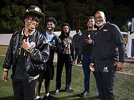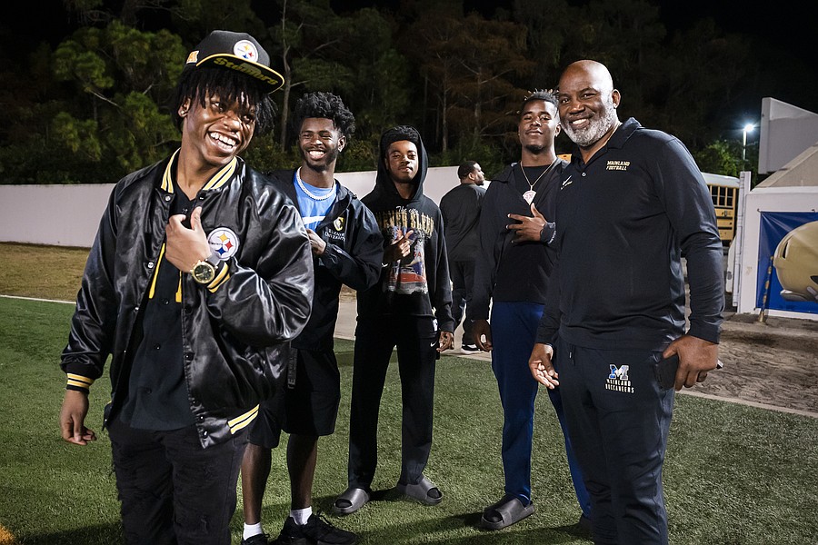 Mainland alumni (left to right) K.J. Curry, Eddie Lake, Jameil Patrick and Phillip Moore hang out with athletic director Terrence "T.A." Anthony (right) at the semifinal playoff game against Mosley on Friday, Nov. 21 at the Daytona Stadium. Photo by Michele Meyers