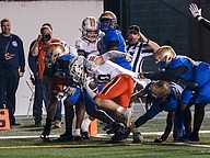 Braylyn Simmons rushes in for a Mainland touchdown (third from right) in the Region 1-5A semifinal against Mosley on Friday, Nov. 21 at the Daytona Stadium. Photo by Michele Meyers