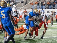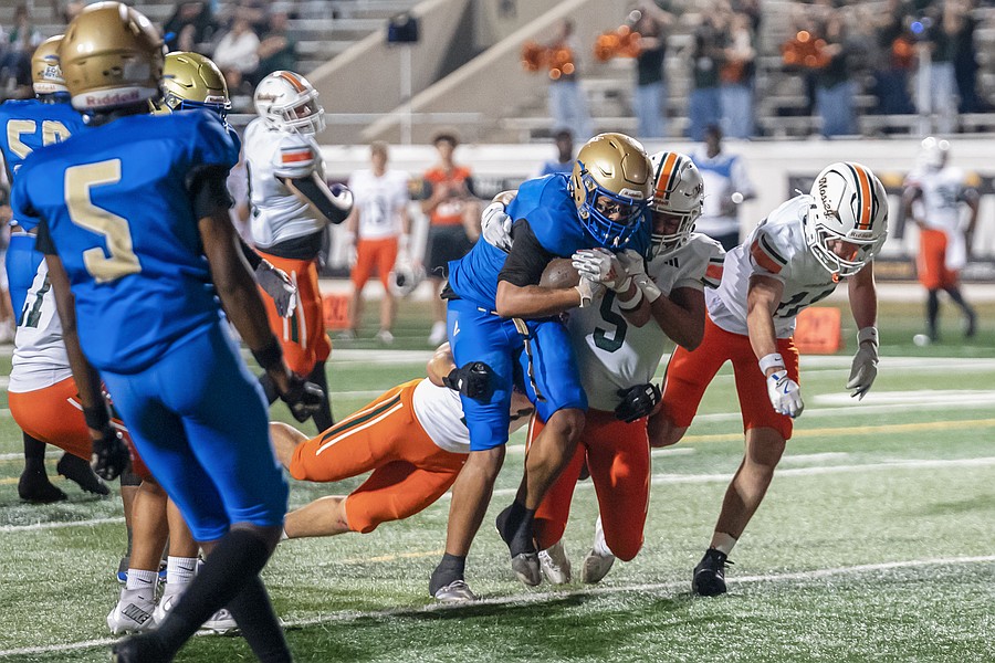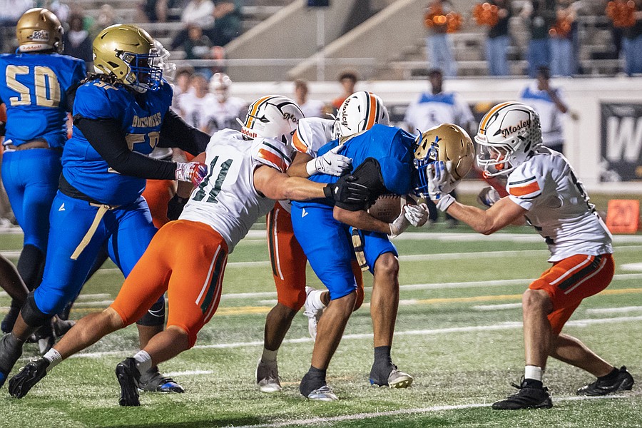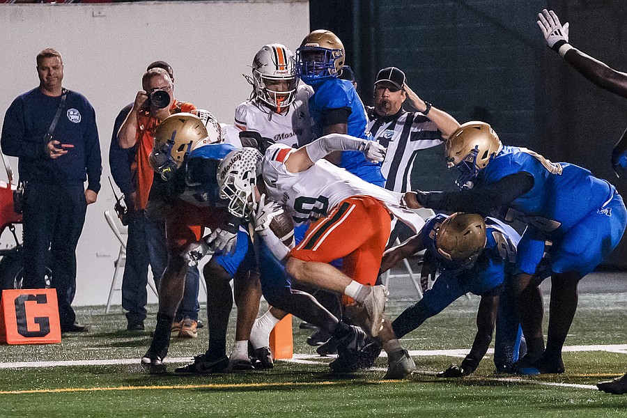 Mosley linebackers (left to right) Wyatt Fleming, Kane Colbert and Talan Moore fail to stop Mainland's Braylyn Simmons from scoring in the Region 1-5A semifinal against Mosley on Friday, Nov. 21 at the Daytona Stadium. Photo by Michele Meyers