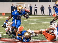 Mainland running back Braylyn Simmons (right) breaks through for a first down during the the Region 1-5A semifinal against Mosley on Friday, Nov. 21 at the Daytona Stadium. Photo by Michele Meyers