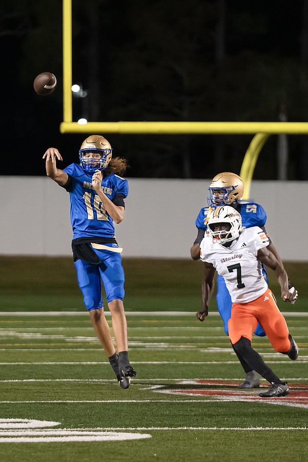 Mainland quarterback Sebastian Johnson (10) passes as Mosley's Will Arboleda (7) rushes him in the Region 1-5A semifinal game against Mosley on Friday, Nov. 14 at the Daytona Stadium. Photo by Michele Meyers
