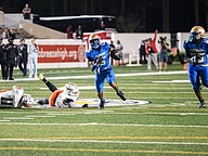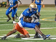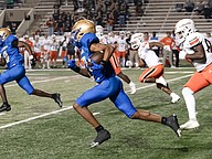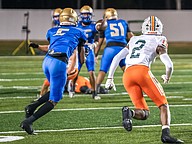 Jhavin "Bubba" Westbrook gains a Mainland first down after intercepting the ball in the Region 1-5A semifinal against Mosley on Friday, Nov. 21 at the Daytona Stadium. Photo by Michele Meyers
