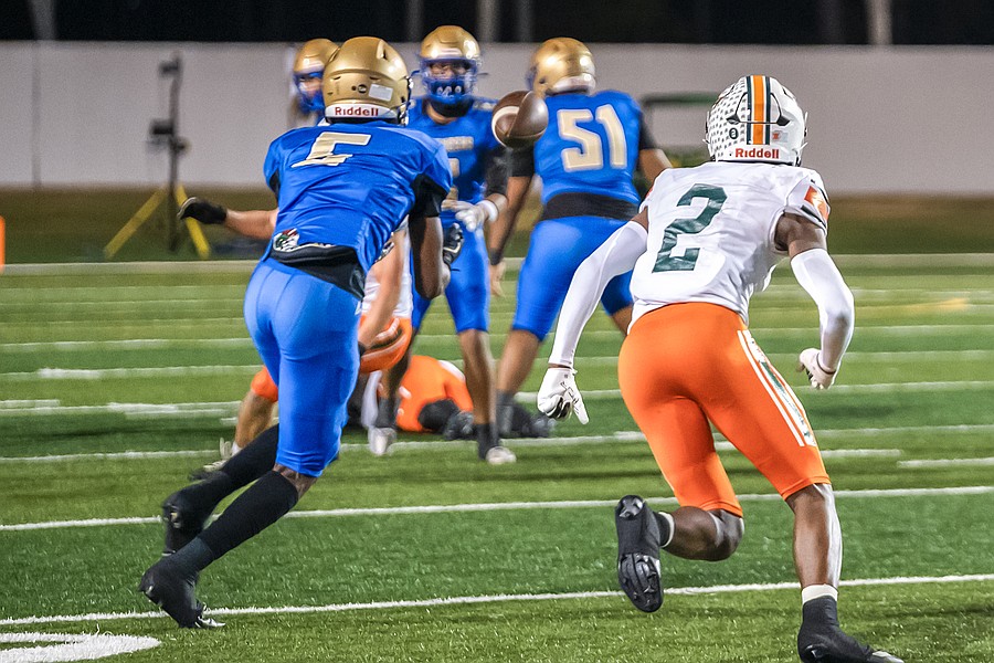 Mainland's Malcolm McArthur (17) blocks Mosley quarterback J.P. Holsombake's (right) pass in the Region 1-5A semifinal on Friday, Nov. 21 at the Daytona Stadium. Photo by Michele Meyers